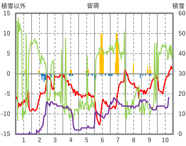 | 日 | 時 | 気温 | 降水 | 風向/風速 | 日照 | 積雪 | 降雪 |
