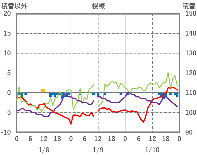 | 日 | 時 | 気温 | 降水 | 風向/風速 | 日照 | 積雪 | 降雪 |