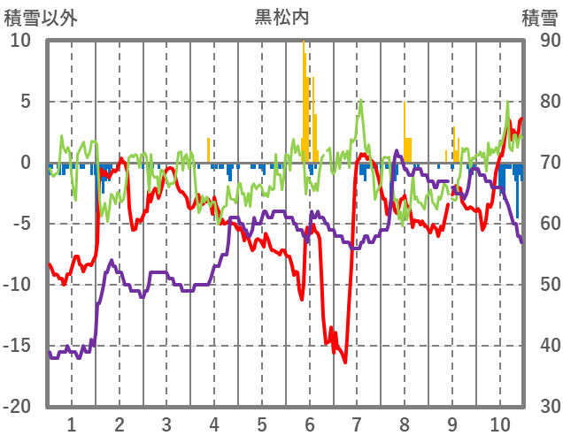 | 日 | 時 | 気温 | 降水 | 風向/風速 | 日照 | 積雪 | 降雪 |