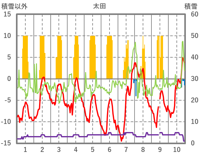 | 日 | 時 | 気温 | 降水 | 風向/風速 | 日照 | 積雪 | 降雪 |