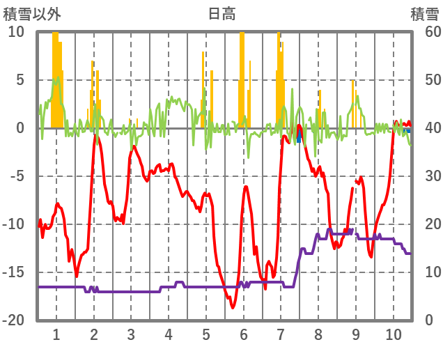 | 日 | 時 | 気温 | 降水 | 風向/風速 | 日照 | 積雪 | 降雪 |