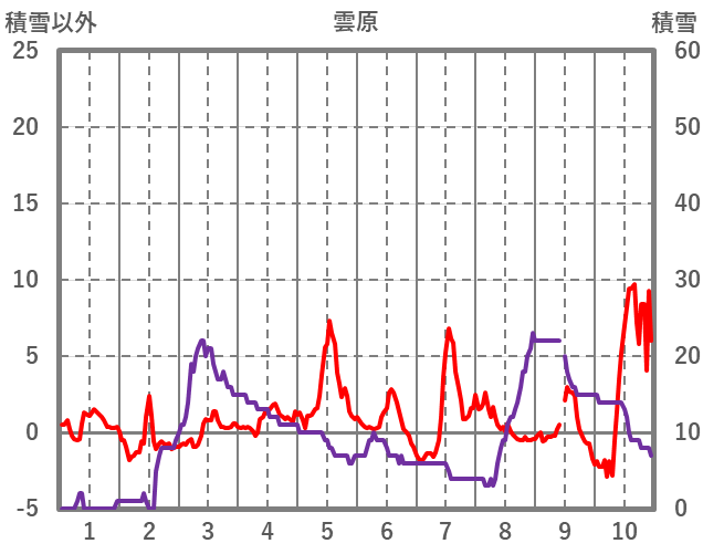 | 日 | 時 | 気温 | 降水 | 風向/風速 | 日照 | 積雪 | 降雪 |