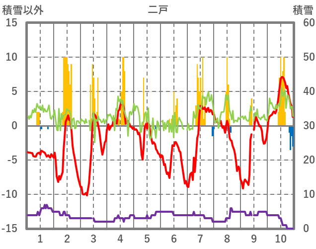 | 日 | 時 | 気温 | 降水 | 風向/風速 | 日照 | 積雪 | 降雪 |
