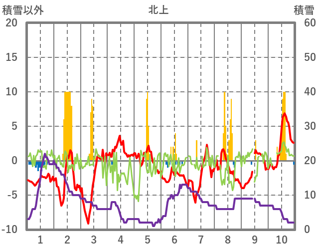 | 日 | 時 | 気温 | 降水 | 風向/風速 | 日照 | 積雪 | 降雪 |