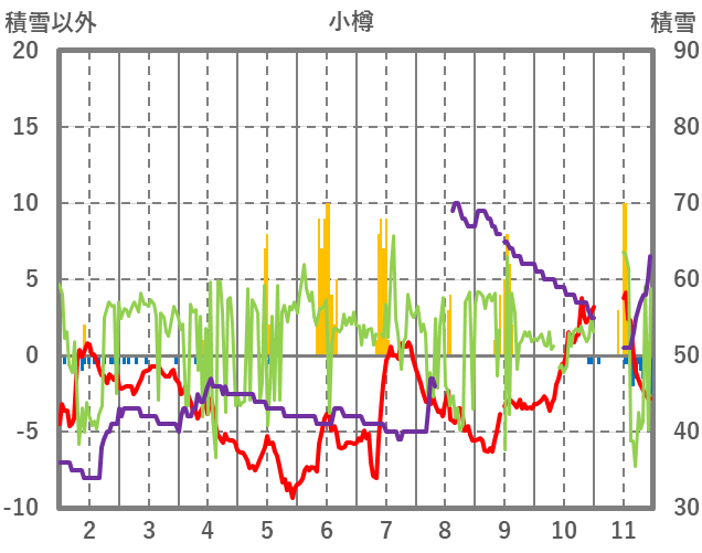 | 日 | 時 | 気温 | 降水 | 風向/風速 | 日照 | 積雪 | 降雪 |