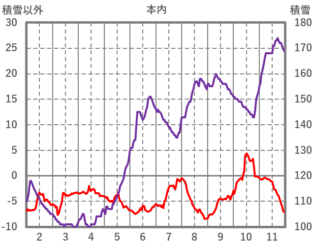 | 日 | 時 | 気温 | 降水 | 風向/風速 | 日照 | 積雪 | 降雪 |