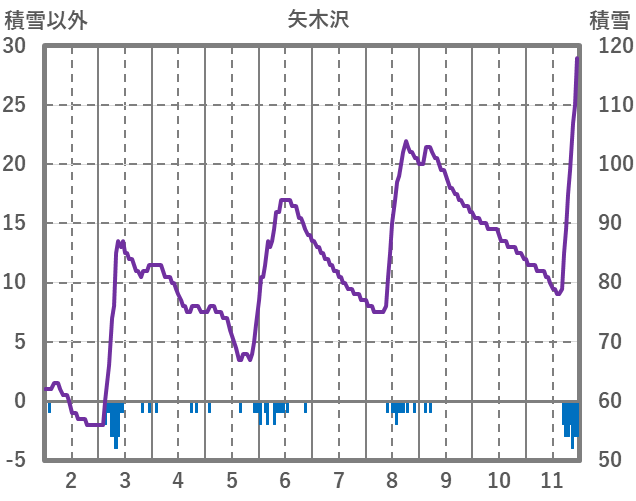 | 日 | 時 | 気温 | 降水 | 風向/風速 | 日照 | 積雪 | 降雪 |