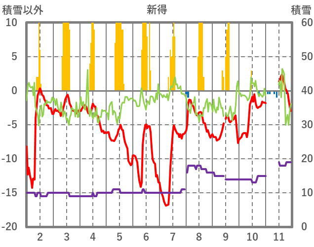 | 日 | 時 | 気温 | 降水 | 風向/風速 | 日照 | 積雪 | 降雪 |