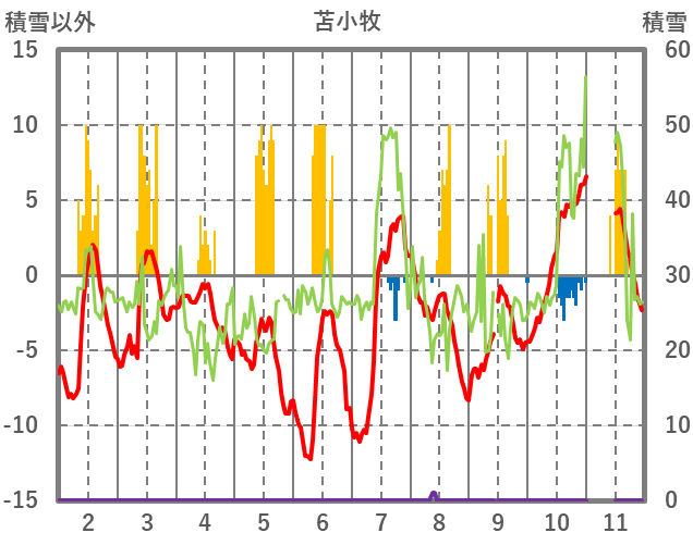 | 日 | 時 | 気温 | 降水 | 風向/風速 | 日照 | 積雪 | 降雪 |