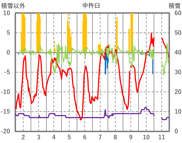 | 日 | 時 | 気温 | 降水 | 風向/風速 | 日照 | 積雪 | 降雪 |