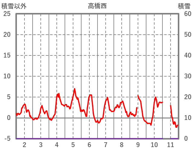 | 日 | 時 | 気温 | 降水 | 風向/風速 | 日照 | 積雪 | 降雪 |