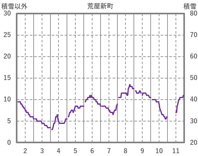 | 日 | 時 | 気温 | 降水 | 風向/風速 | 日照 | 積雪 | 降雪 |
