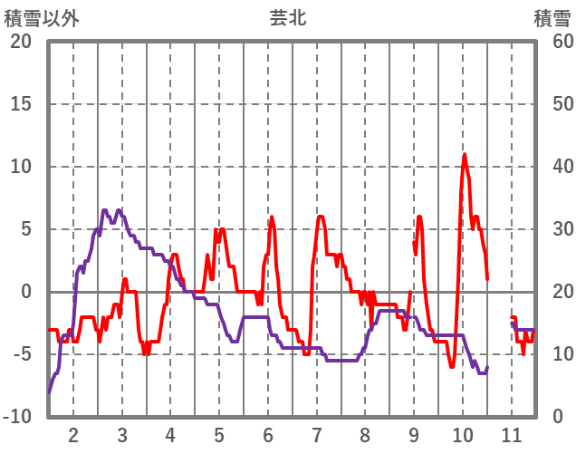 | 日 | 時 | 気温 | 降水 | 風向/風速 | 日照 | 積雪 | 降雪 |