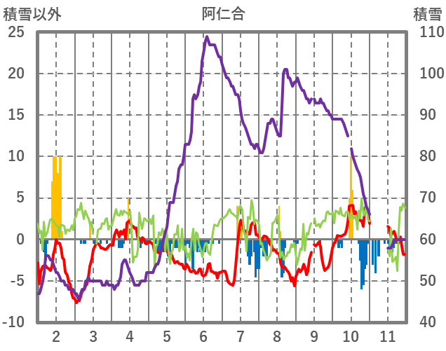 | 日 | 時 | 気温 | 降水 | 風向/風速 | 日照 | 積雪 | 降雪 |