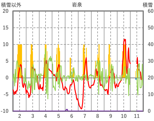 | 日 | 時 | 気温 | 降水 | 風向/風速 | 日照 | 積雪 | 降雪 |