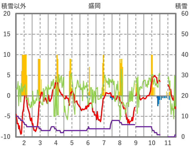| 日 | 時 | 気温 | 降水 | 風向/風速 | 日照 | 積雪 | 降雪 |