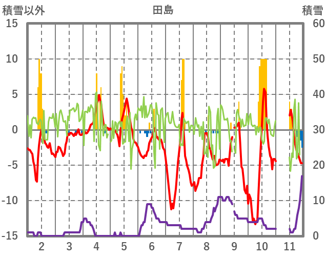 | 日 | 時 | 気温 | 降水 | 風向/風速 | 日照 | 積雪 | 降雪 |