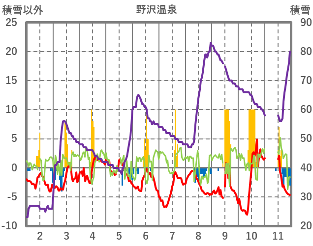 | 日 | 時 | 気温 | 降水 | 風向/風速 | 日照 | 積雪 | 降雪 |