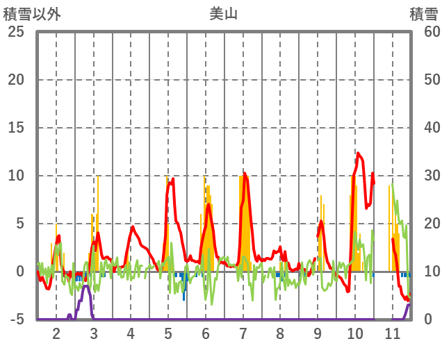 | 日 | 時 | 気温 | 降水 | 風向/風速 | 日照 | 積雪 | 降雪 |