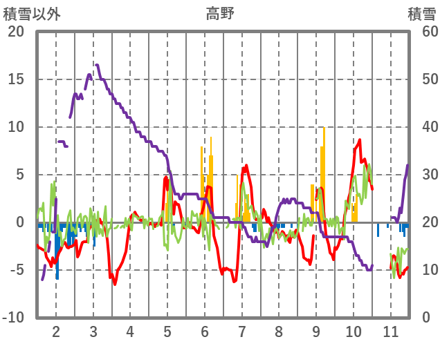 | 日 | 時 | 気温 | 降水 | 風向/風速 | 日照 | 積雪 | 降雪 |