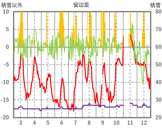 | 日 | 時 | 気温 | 降水 | 風向/風速 | 日照 | 積雪 | 降雪 |