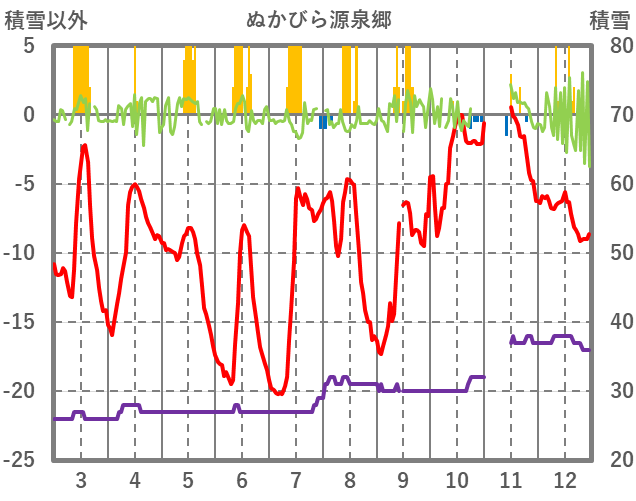 | 日 | 時 | 気温 | 降水 | 風向/風速 | 日照 | 積雪 | 降雪 |