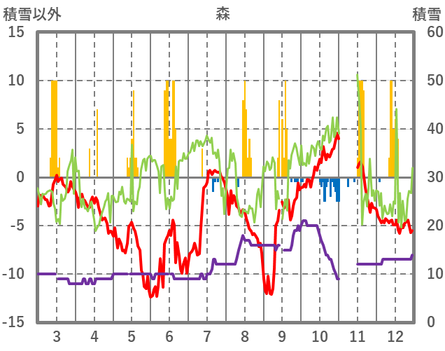 | 日 | 時 | 気温 | 降水 | 風向/風速 | 日照 | 積雪 | 降雪 |