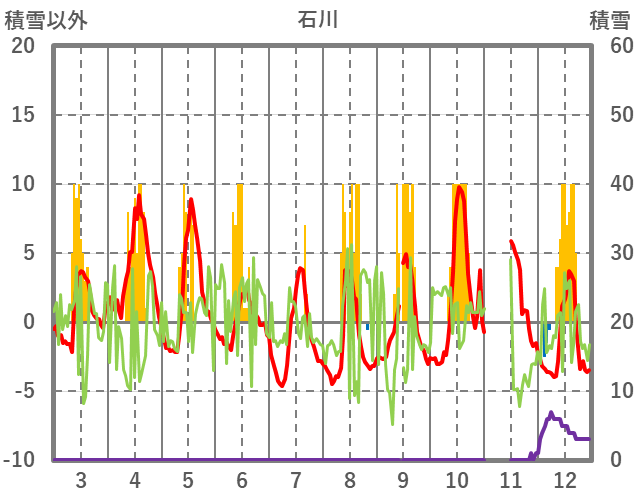 | 日 | 時 | 気温 | 降水 | 風向/風速 | 日照 | 積雪 | 降雪 |