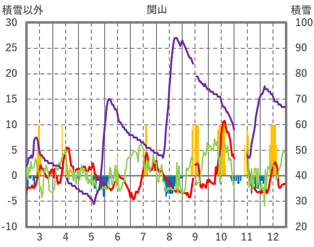 | 日 | 時 | 気温 | 降水 | 風向/風速 | 日照 | 積雪 | 降雪 |