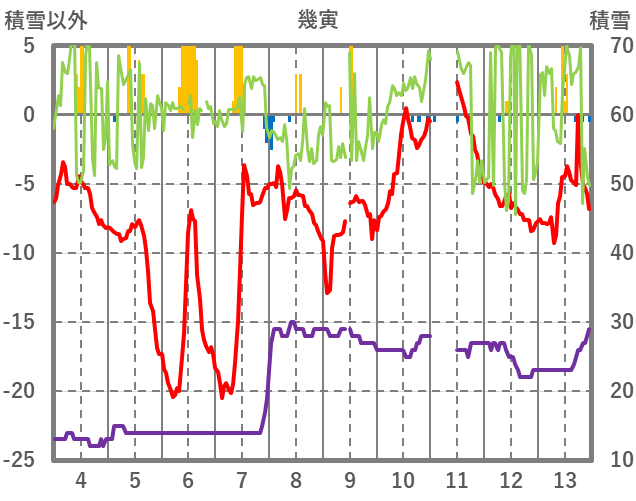| 日 | 時 | 気温 | 降水 | 風向/風速 | 日照 | 積雪 | 降雪 |
