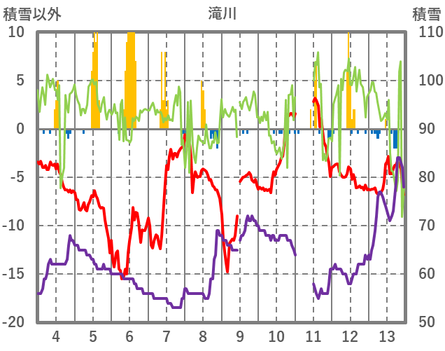 | 日 | 時 | 気温 | 降水 | 風向/風速 | 日照 | 積雪 | 降雪 |