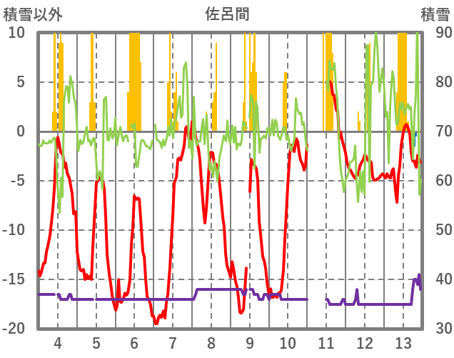 | 日 | 時 | 気温 | 降水 | 風向/風速 | 日照 | 積雪 | 降雪 |