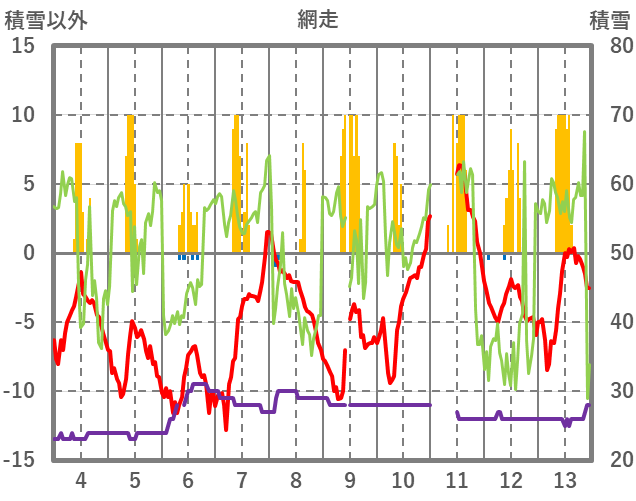 | 日 | 時 | 気温 | 降水 | 風向/風速 | 日照 | 積雪 | 降雪 |