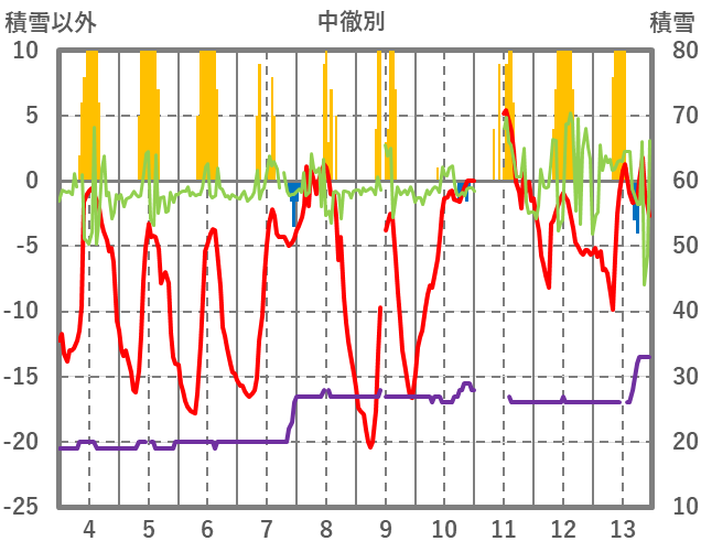 | 日 | 時 | 気温 | 降水 | 風向/風速 | 日照 | 積雪 | 降雪 |