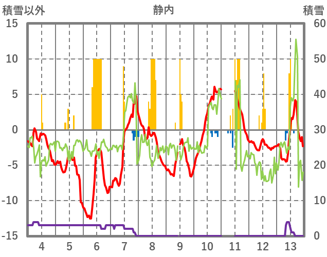 | 日 | 時 | 気温 | 降水 | 風向/風速 | 日照 | 積雪 | 降雪 |