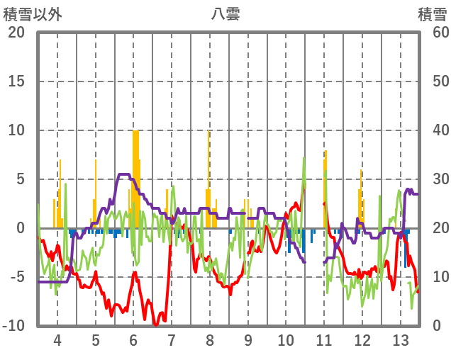 | 日 | 時 | 気温 | 降水 | 風向/風速 | 日照 | 積雪 | 降雪 |