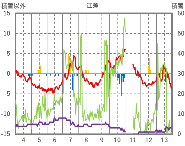 | 日 | 時 | 気温 | 降水 | 風向/風速 | 日照 | 積雪 | 降雪 |