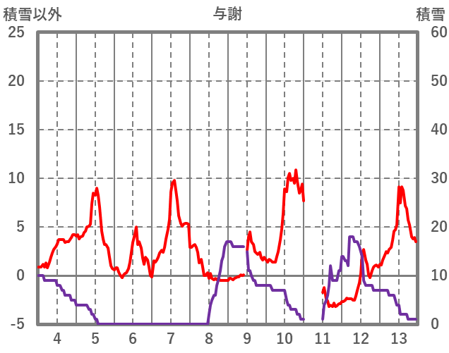 | 日 | 時 | 気温 | 降水 | 風向/風速 | 日照 | 積雪 | 降雪 |