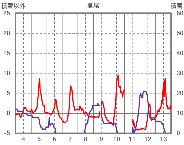 | 日 | 時 | 気温 | 降水 | 風向/風速 | 日照 | 積雪 | 降雪 |