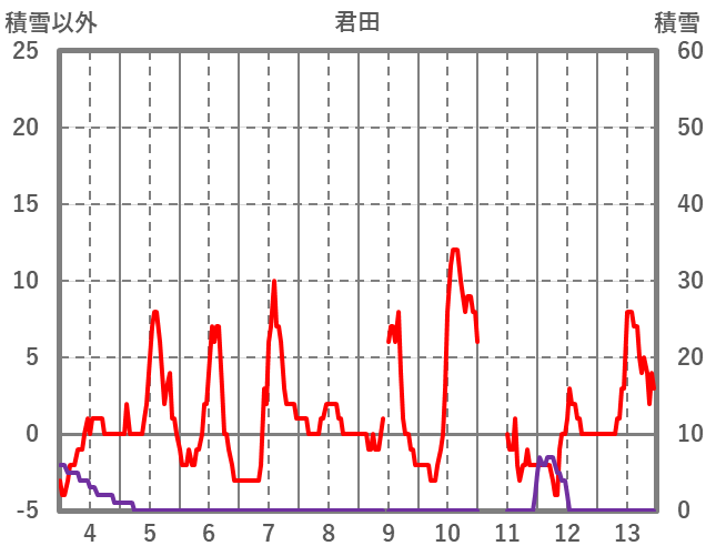 | 日 | 時 | 気温 | 降水 | 風向/風速 | 日照 | 積雪 | 降雪 |