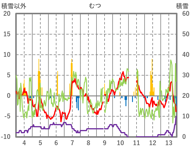 | 日 | 時 | 気温 | 降水 | 風向/風速 | 日照 | 積雪 | 降雪 |