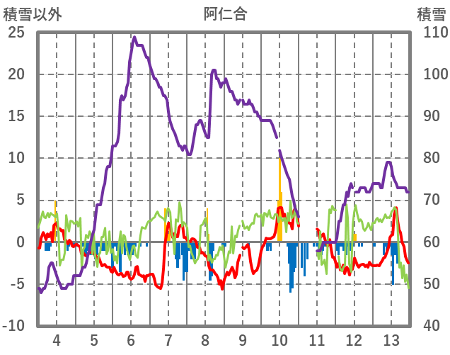 | 日 | 時 | 気温 | 降水 | 風向/風速 | 日照 | 積雪 | 降雪 |