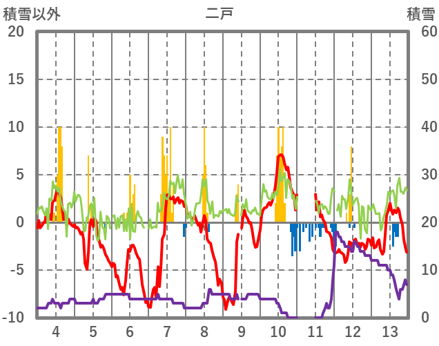 | 日 | 時 | 気温 | 降水 | 風向/風速 | 日照 | 積雪 | 降雪 |