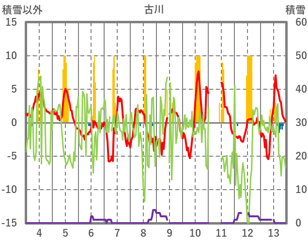 | 日 | 時 | 気温 | 降水 | 風向/風速 | 日照 | 積雪 | 降雪 |