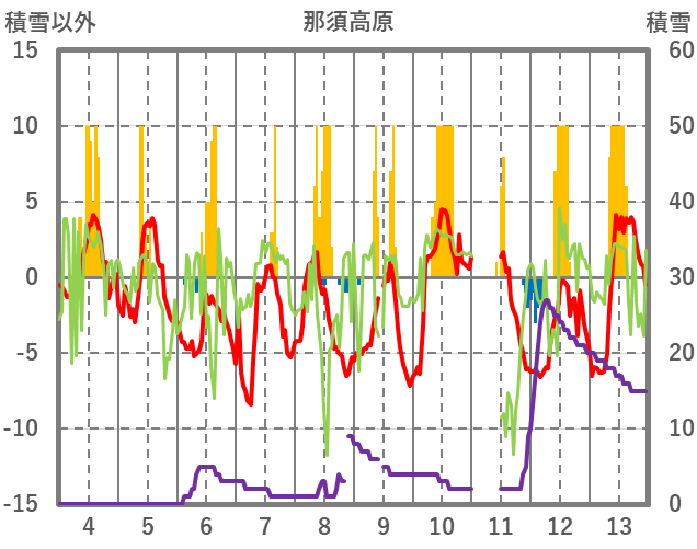 | 日 | 時 | 気温 | 降水 | 風向/風速 | 日照 | 積雪 | 降雪 |