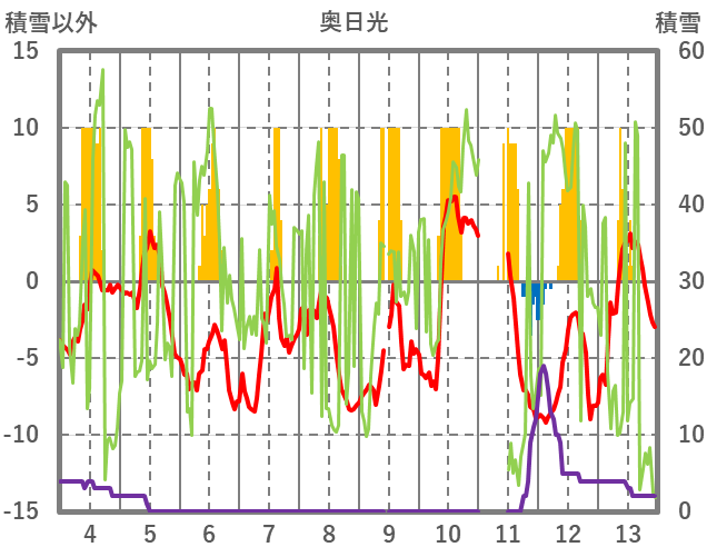 | 日 | 時 | 気温 | 降水 | 風向/風速 | 日照 | 積雪 | 降雪 |