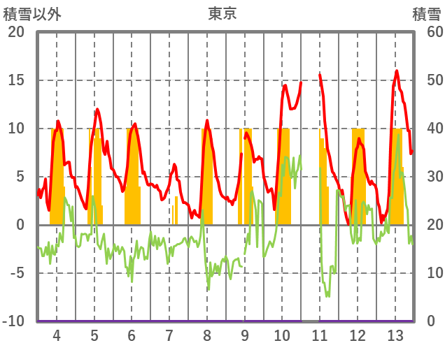 | 日 | 時 | 気温 | 降水 | 風向/風速 | 日照 | 積雪 | 降雪 |