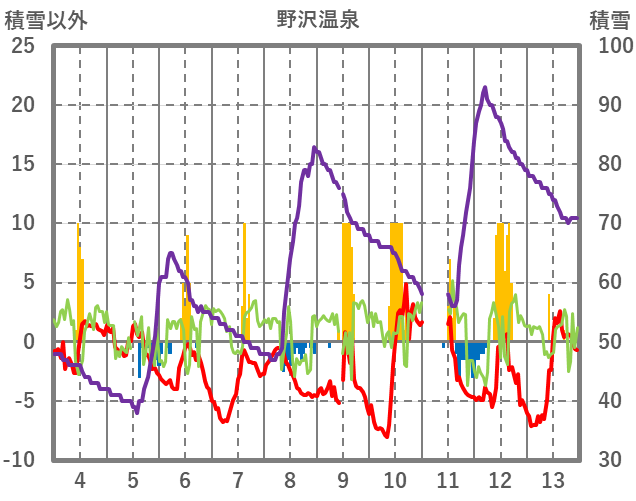 | 日 | 時 | 気温 | 降水 | 風向/風速 | 日照 | 積雪 | 降雪 |