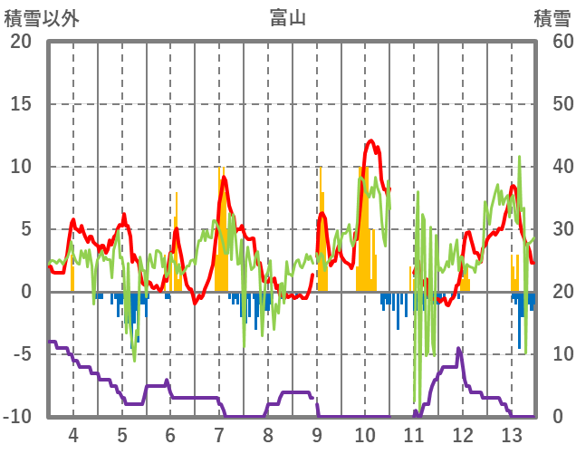 | 日 | 時 | 気温 | 降水 | 風向/風速 | 日照 | 積雪 | 降雪 |