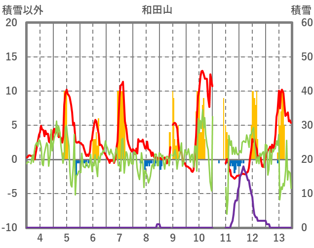 | 日 | 時 | 気温 | 降水 | 風向/風速 | 日照 | 積雪 | 降雪 |